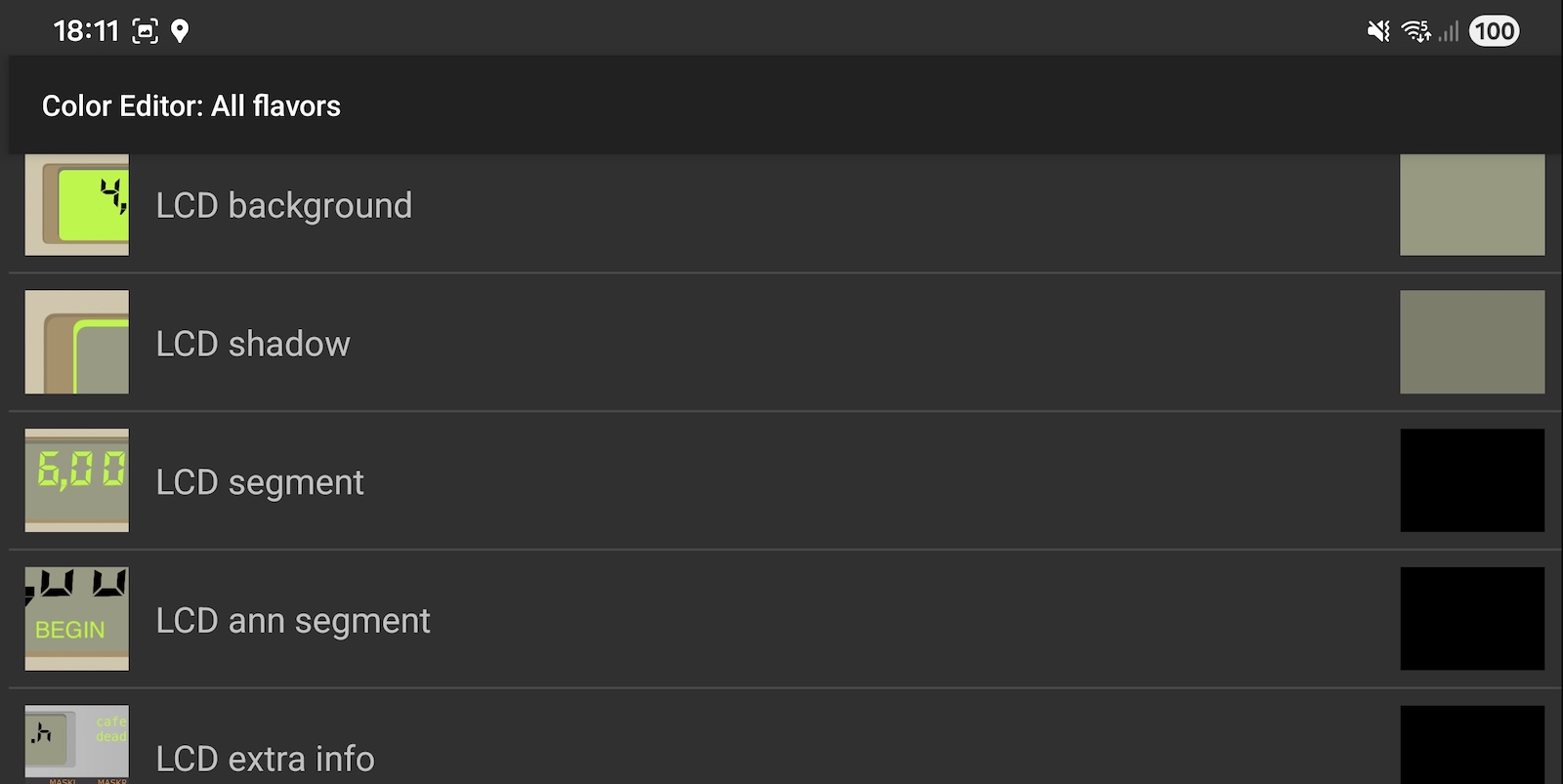 All colors of the main graphical interface can now be changed and tweaked. This feature can be accessed either through an LCD gesture (long press, left side) or through a button in Settings pane.