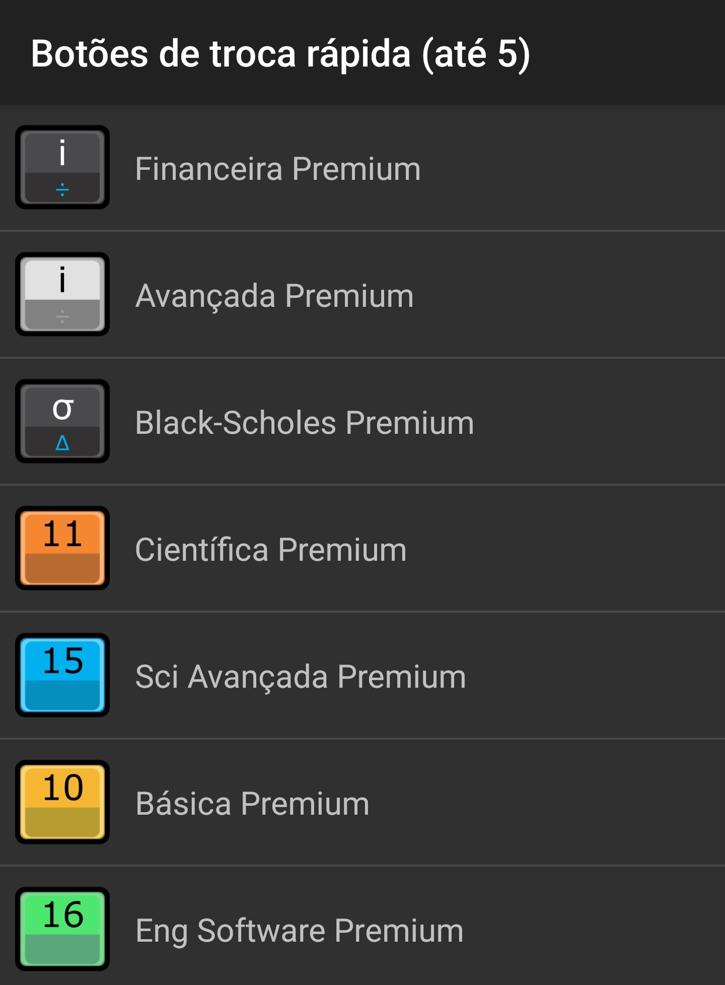 Se você já comprou dois ou mais tipos RPN, pode ativar os botões de troca rápida. São atalhos que permitem, por exemplo, mudar de calculadora financeira para científica e vice-versa sem ter de entrar nas Configurações.