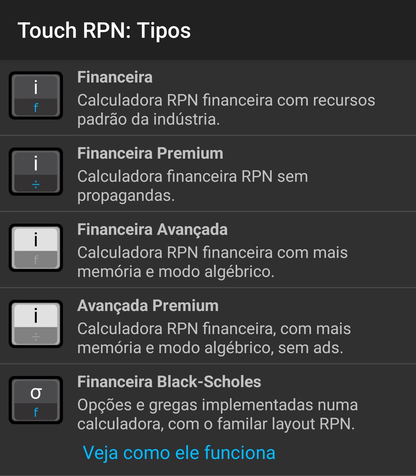 Existem sete tipos. Cada um deles é oferecido em duas modalidades: gratuito (com ads) e pago (sem ads). Para trocar o tipo em uso, pressione ON para abrir as Configurações, toque em "Tipo de calculadora" e escolha o tipo desejado.