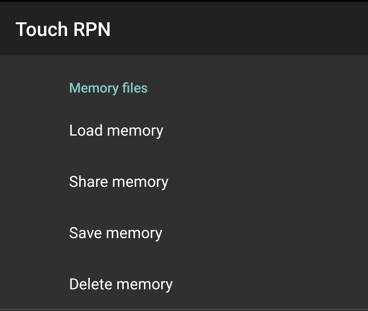 For example, if you got a memory via WhatsApp, long-press the file, choose the Share action, and choose the Touch RPN app to open the file (among the others that can open text files). You can save the memory over an existing name, or create a new one.